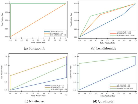The training data used in the models produced the ROC curves illustrated in Figure 7. From these, it is seen that the three presented ML models perform differently, and their performance varies for the different drugs. For Bortezomib, SVM+SMOTE works excellently, resulting in a AUC value equal to 1, but the other two models do not perform well, producing identical ROC curves with the same AUC value of 0.5. For Lenalidomide, the performance is significantly improved when SVM+SMOTE is employed. In this case, RF+CNN improves, but LR+OSS fails with an AUC value of 0.458. For Navitoclax, RF+CNN exhibits the best performance, but it is quite low compared to other drugs. For Quisinostat, we notice that both SVM+SMOTE and RF+CNN have a high sensitivity and specificity rate, as revealed by the ROCs with a high AUC value of 0.9, while LR+OSS does not result in high accuracy of predictions.