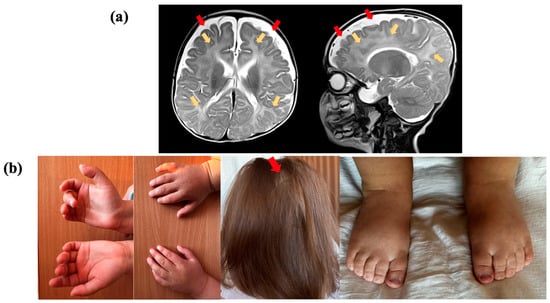 Clinical presentation of the proband, who had a variant in the TRA2B gene: (a) Brain magnetic resonance imaging (MRI) of the proband at the age of 5 months, in T2-weighted sequence, reveals abnormal paraventricular and subcortical white matter signals (yellow arrows) and the accumulation of cerebrospinal fluid over the frontotemporal areas (red arrows); (b) proband showing cutaneous syndactyly of the 2nd and 3rd toes, clinodactyly of the 5th finger, and alopecia areata.