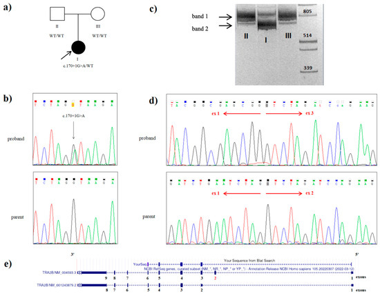 Genetic testing of the proband with a variant in the TRA2B gene: (a) the family tree showing the affected proband (I) and unaffected parents (II and III); (b) Sanger sequencing of the DNA results demonstrating the heterozygous c.170+1G>A splice TRA2B mutation in the proband; (c) visualization of cDNA amplification products for the proband (I) and her parents (II and III) with primers flanking 5‘UTR and exon 9 of the TRA2B gene. Band I (828 bp) includes the sequences of exons 1, 2, 3, 4, 5, 6, 7, 8, and 9 of the TRA2B gene, which corresponds to the canonical protein-coding transcript 1. Band II (694 bp) includes the sequences of exons 1, 3, 4, 5, 6, 7, 8, and 9 of the TRA2B gene without exon 2. This amplicon was present in the proband (I) and absent in her parents (II and III); (d) Sanger sequencing of the proband’s band 2, extracted from the gel and father’s cDNA amplicon: the electropherograms shows the presence of the aberrant TRA2B transcript with the exon 2 skipped in patient, while his father possesses only the canonical TRA2B transcript variant; (e) alignment of the patient’s cDNA sequence in the UCSC genomic browser.