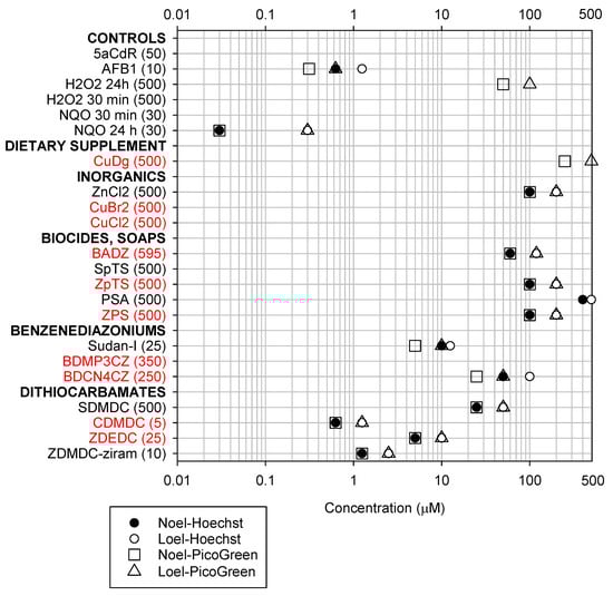 The effect of treatment with different copper and zinc chemicals on the reduction in cellular abundance. The no-observable-effect levels (NOELs: black circle, and square) and lowest-observable-effect levels (LOELs: open circle and triangle) were derived from concentration–response experiments. As a proxy for cellular abundance, DNA abundance data were obtained from Hoechst or PicoGreen DNA staining from the γH2AX or SSF assays, respectively. Some data were from only the Hoechst (phenolsulfonic acid (PSA)) or the PicoGreen assays (hydrogen peroxide (H2O2) 24 h, copper(II) D-gluconate (CuDg)), while other listed chemicals did not show any symbols because they did not induce significant changes over the tested concentration range. The largest concentration tested is provided within the parenthesis beside the chemical name. No NOEL symbols are provided when the LOEL was the smallest concentration tested. Chemicals in red font are “data-poor” chemicals.
