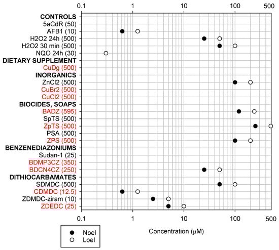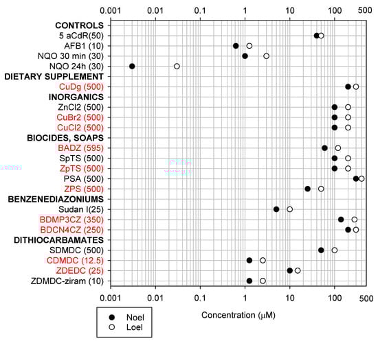 The effect of treatment with different copper and zinc chemicals on the elevation of strand scission factor (SSF) values as an indication of DNA damage. No-observable-effect levels (NOELs, black circle) and lowest-observable-effect levels (LOELs, open circle) were derived from concentration–response experiments. The largest concentration tested is provided within the parenthesis beside the chemical name. NOEL was not provided for 4-nitroquinoline-oxide (NQO), as the smallest concentration tested was the LOEL. Some chemicals do not have any symbols because they did not induce a significant change at the highest concentration. Chemicals in red font are “data-poor” chemicals.