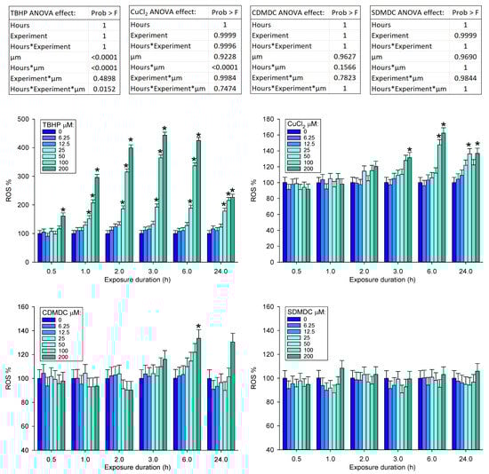 Abundance of reactive oxygen species (ROS) induced by increasing concentrations (6.25 µM to 200 µM) of copper chloride (CuCl2), copper dimethyldithiocarbamate (CDMDC) and sodium dimethyldithiocarbamate (SDMDC). Tert-butyl hydrogen peroxide (TBHP) was used as the positive control. The exposure time varied from 0.5 h up to 24 h. Least squares mean + standard error (SE) from a full factorial ANOVA combining three separate experiments (n = 3 wells/group/experiment). The CDMDC data at 6 h were also analyzed separately from other time points, testing the effects of concentration (p = 0.005), experiment (p = 0.99), and concentration X experiment (p = 0.99). *: indicates increases above control; Dunnett’s test p < 0.05).