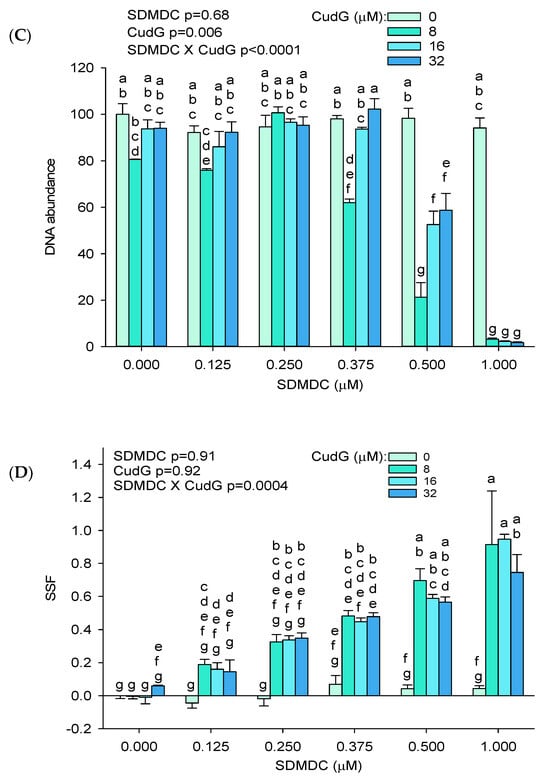 The toxicity of sodium dimethyldithiocarbamate (SDMDC) was enhanced when cells were exposed in combination with copper(II) chloride (CuCl2) or copper(II) D-gluconate (CuDg). Changes in DNA abundance and DNA damage expressed by the strand scission factor (SSF) following a 72 h exposure to CuCl2 (A,B) or to CuDg (C,D) in the presence of SDMDC. (A,B) are represented by the least squares mean + SE of a full factorial ANOVA from three separate experiments with three wells per treatment in each experiment. (C,D) are from one experiment (mean + SE, n = three wells per group). Means with different letters are significantly different, Tukey’s HSD p < 0.05. The letter “a” was assigned to the largest mean, “b” was assigned to the second largest mean, and so on. Means that share at least one letter are not significantly different.