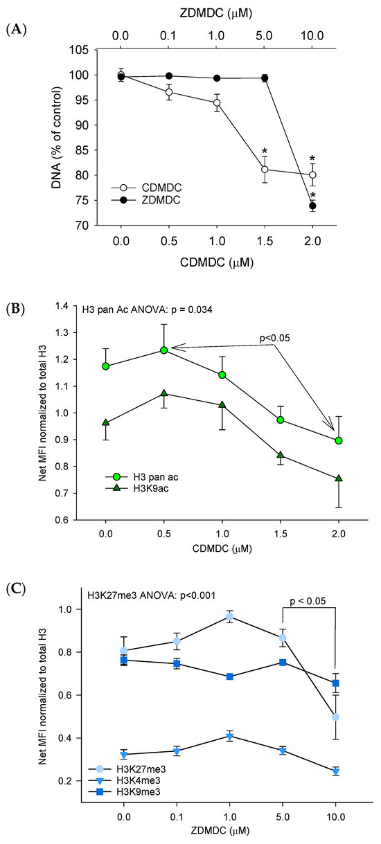 Multiplex bead array screening results for effects of 24 h exposure to copper dimethyldithiocarbamate (CDMDC) or to zinc dimethyldithiocarbamate (ZDMDC) on (A) the abundance of DNA relative to the control group. (B) CDMDC at 2 µM decreased the pan-acetylation of H3 relative to 0.5 µM (p = 0.03), but the effects on acetylated histone H3 lysine 9 (H3K9ac) did not reach statistical significance (error bars unidirectional to avoid overlapping). (C) The effects of ZDMDC on the abundance of H3K27 trimethyl (H3K27me3), H3K9me3 and H3K4me3. Mean + SE, n = 4. One-way ANOVA followed by Tukey’s HSD for multiple comparisons. *: different from control, p < 0.05. The relative histone H3 acetylation and methylation levels (B,C) are expressed as the ratio of net median fluorescence intensity (MFI) of the histone H3 modification relative to the net MFI of the total histone H3.