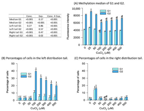 Concentration–response effects of copper chloride (CuCl2) on global genome DNA methylation (72 h exposure). The related percent changes in DNA methylation are presented in Figure S10. (A) The median fluorescence intensity of G1 cells decreased (d) significantly only at 100 µM, whereas G2 cells showed increased (i) intensity at 25 µM, followed by a reduction at concentrations equal or larger than 100 µM. This is in line with (B), showing the greater abundance of cells in the left tail of the G2 distribution, and (C), showing an increase in the percentage of cells in the right tail at 25 µM and a decrease at 100 µM. Least squares mean + SE, from three experiments with n = 2 to 3 samples per group within each experiment. The data in graph (A,C) were log-transformed for statistical analyses. Two-way ANOVAs followed by Dunnett’s multiple comparisons method versus 0 µM, p < 0.05.