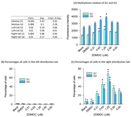 The concentration–response effects of 72 h of exposure to ZDMDC showed increases in global genome DNA methylation at 0.625 µM and 1.25 µM in both the G1 and G2 cell populations (Figure 9). These effects were associated with increases in the percentage of cells in the right tails occurring at the same concentrations. The cell number declined relative to the DMSO group (100% of cells), from 75% at 0.625 µM, 69% at 1.25 µM, down to 65% in the 5 µM group.