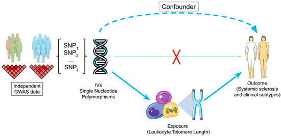 Framework of the 2SMR study for leukocyte telomere length and systemic sclerosis. The 2SMR approach utilizes data from two independent GWAS and employs SNPs as instrumental variables. The selected SNPs are associated with the exposure, influence the outcome only through the exposure and should not be associated with any confounder. Parts of the figure were drawn by using and modifying pictures from Servier Medical Art. Servier Medical Art by Servier is licensed under a Creative Commons Attribution 3.0 Unported License (https://creativecommons.org/licenses/by/3.0/), accessed on 26 September 2023. 2SMR: two-sample Mendelian randomization; GWAS: genome-wide association studies; IV: instrumental variable; SNP: single-nucleotide polymorphism.