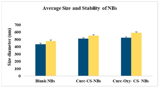 The average diameter of the Curc-CS-NBs, and Curc-Oxy-CS-NBs was measured over time and the results are presented as mean ± standard deviation (SD) based on three samples. The blue color corresponds to measurements at time 0 and the yellow color represents measurements after 2 months.