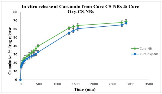 Studies on the in vitro release of curcumin from Curc-CS-NBs and Curc-Oxy-CS-NBs were conducted. The findings of the release research are reported in Figure 3. For both formulations, the percentage of curcumin released during a prolonged time period was assessed. The amount of curcumin released from Curc-CS-NB and Curc-Oxy-CS-NB after 48 h was 69.14% and 66.98%, respectively. These findings show that the curcumin is well incorporated and released from both formulations with sustained kinetics, which suggests prolonged activity over time.
