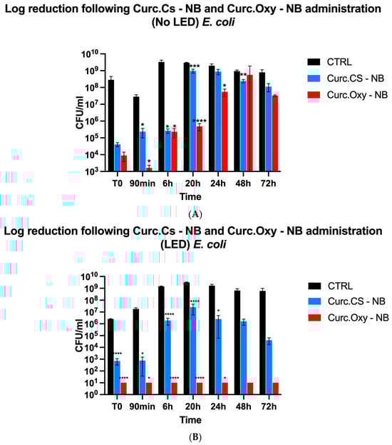 Graphical representation of the killing activity against E. coli comparing the efficacy of Curc-NBs and Curc-Oxy-NBs under different conditions. (A) Killing activity of Curc-NBs vs. Curc-Oxy-NBs in the absence of LED light. (B) Killing activity of Curc-NBs vs. Curc-Oxy-NBs in the presence of LED light. Results are shown as means ± SEM from three independent experiments and expressed as Log CFUs/mL. Data were evaluated for significance by Student’s t-test. Vs controls: * p = 0.0332; ** p = 0.0021; *** p = 0.0002; **** p < 0.0001.