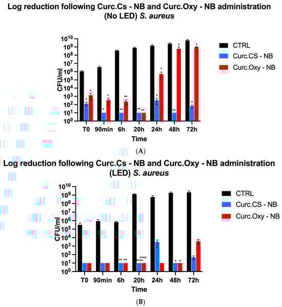 Graphical representation of killing activity against S. aureus. (A) Comparison between Curc-NBs and Curc-Oxy-NBs without LED light. (B) Comparison between Curc-NBs and Curc-Oxy-NBs with LED light. Results are shown as means ± SEM from three independent experiments and expressed as Log CFUs/mL. Data were evaluated for significance by Student’s t-test. Vs controls: * p = 0.0332; ** p = 0.0021; **** p < 0.0001.