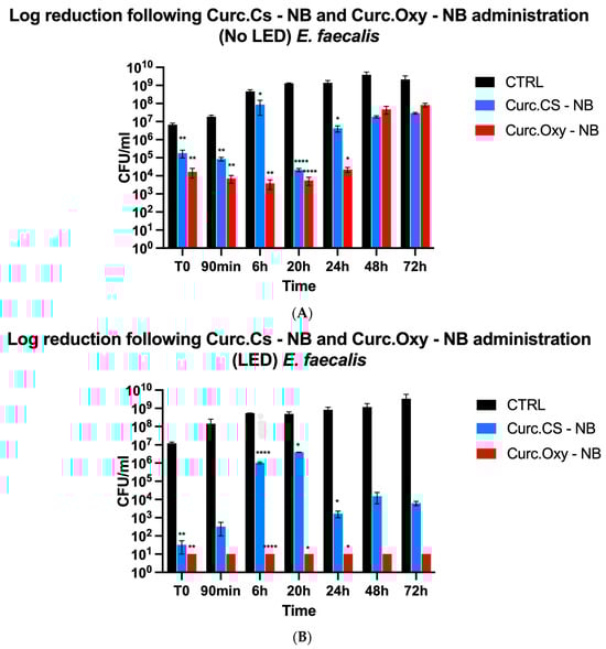 Killing effect against E. faecalis. (A) Comparison between Curc-NBs and Curc-Oxy-NBs without LED light. (B) Comparison between Curc-NBs and Curc-Oxy-NBs with LED light. Results are shown as means ± SEM from three independent experiments and expressed as Log CFUs/mL. Data were evaluated for significance by Student’s t-test. Vs controls: * p = 0.0332; ** p = 0.0021; **** p < 0.0001.