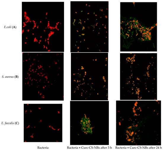 Confocal microscopy (Figure 7) showed that, starting from the first observation (3 h), and also, subsequently, (24 h), the Curc-CS-NBs seemed to adhere to the wall of E. coli without being internalized (A), while the Curc-CS-NBs appeared to be eagerly taken up and internalized by staphylococci (B) and enterococci (C). These findings provide valuable insights into the specific interactions of Curc-CS-NBs with different bacterial strains, offering potential approaches for enhancing antimicrobial efficacy and targeting specific pathogens.