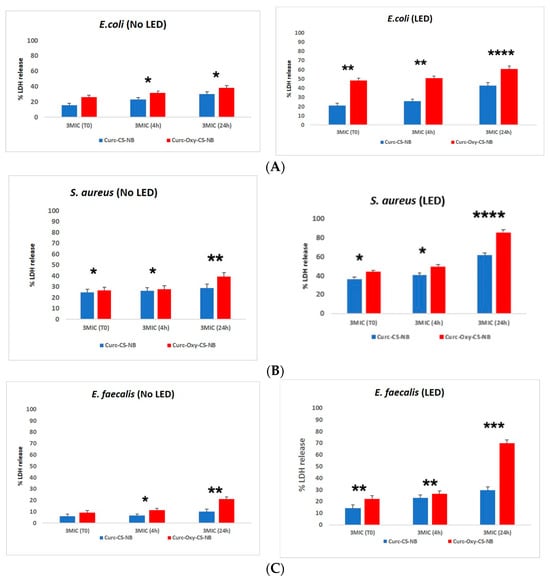For Curc-CS-NBs and Curc-Oxy-CS-NBs, the proportion of LDH released in a dark environment ranged from 6% to 49%. However, the percentage of LDH released for Curc-NBs and Curc-Oxy-CS-NBs after LED application varied from 10% to 85%. The three bacterial strains that were examined had different membrane damage onset times. The observed impacts on bacterial membranes and the subsequent antimicrobial activity can be explained by the presence of oxygen and by LED irradiation, which causes the production of reactive oxygen species (ROS).