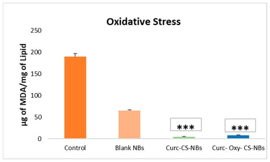 The formulations of Curc-CS-NBs and Curc-Oxy-CS-NBs demonstrate a significant reduction in lipid peroxidation. The statistical analysis shows that the difference is highly significant, denoted by *** indicating p < 0.001.