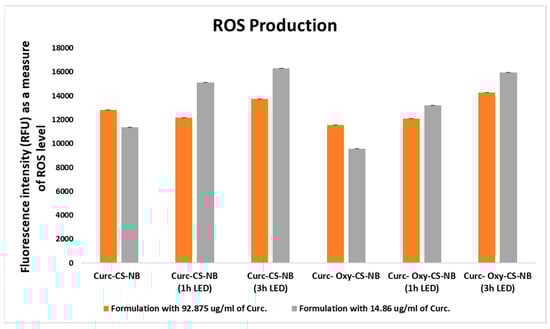The study’s results show that when the curcumin formulations were subjected to 3 h of LED irradiation and when oxygen was present in the NBs, ROS generation was greater. The study’s findings also showed that ROS production was correlated with a drop in curcumin content in NBs (Figure 10).