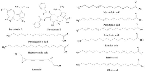 Repandiol is a compound produced by H. repandum that demonstrates cytotoxic activity against various cancer cell types, primarily colon adenocarcinoma cells. Chloroform extracts from this mushroom have a mildly antibiotic effect against Staphylococcus epidermidis, Staphylococcus aureus, Enterobacter aerogenes, and Bacillus subtilis. Ethanol extracts are active only against Bacillus subtilis [17,56]. Furthermore, sarcodonin A and scabronine B, along with other related compounds, have been isolated from H. repandum [57]. Fatty acids like oleic, stearic, pentadecanoic, heptadecanoic, palmitoleic, linolenic, palmitic and myristoleic acids were found in the fruiting bodies of H. repandum (Figure 2) [58]. In another study, it was observed that H. repandum exhibited good antioxidant, proapoptotic, cytotoxic, and antiproliferative activities [59]. The impact of extracts from H. repandum on the development and sporulation of Penicillium expansum was examined and generated results showing substantial inhibition of mycelial growth and a reduction in pathogen sporulation [60].