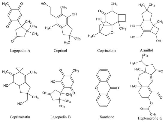 C. plicatilis (or Parasola plicatilis), commonly known as the “shaggy ink cap”, is a species of mushroom belonging to the genus Coprinus [61]. It is a basidiomycete fungus found in many parts of the world, typically growing in grassy areas, lawns, meadows, and woodlands. The cap of C. plicatilis starts out convex and expands up to 2–6 cm diameter. C. plicatilis is generally considered edible when consumed in its early stages before the cap begins to blacken and liquefy [62]. The Coprinus sp. are rich in secondary metabolites such as terpenoids, including sesquiterpenes such as the lagopodins [63], coprinol [64], coprinolone [65], illudins [66], armillol, coprinastatin, heptemerones, coprinacins, and xanthothone, respectively [67] (Figure 3). These compounds exhibit a wide spectrum of biological activities, ranging from antibacterial, cytotoxic, antifungal to nematicidal [67].