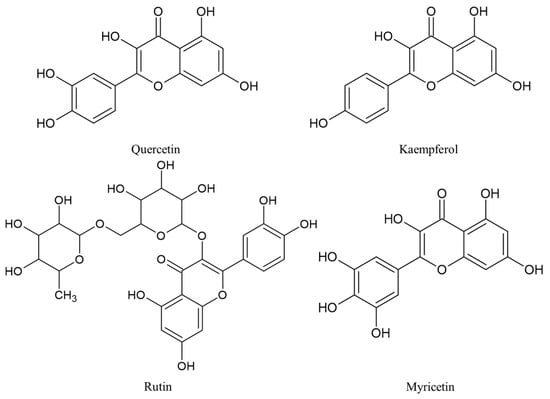 M. vulgaris, commonly known as the common morel, is a species of edible mushroom [68]. Phylogenetic and nomenclatural studies confirmed the status of M. vulgaris as a distinct species and resolved several of its synonymities [69]. The common morels have a unique and recognizable appearance with honeycomb-like caps with ridges and pits that give them a sponge-like texture. The caps can vary in color from pale tan to dark brown and are usually conical or cylindrical in shape [70,71,72]. M. vulgaris and other morel species have been studied for their bioactive compounds. There are some bioactive compounds found in morels which include antioxidants, polysaccharides, vitamin D, amino acids, and terpenes [72,73]. Morels are rich in antioxidants, which help protect the body against oxidative stress caused by free radicals. These antioxidants include compounds such as phenolic compounds, flavonoids (including quercetin, rutin, kaempferol, and myricetin), and ascorbic acid (vitamin C). Morels also contain various polysaccharides which are complex carbohydrates that possess immunomodulating, anti-inflammatory, and antitumor properties [74]. M. vulgaris is also a natural source of vitamin D which is essential for bone health, immune function, and various other physiological processes in the body. Morels contain several essential amino acids, including lysine, leucine, and valine. Morels also contain various terpenes, which are organic compounds responsible for the characteristic aroma and flavor of the mushroom [75]. Some terpenes found in morels, such as sesquiterpenes, have been investigated for their potential anti-inflammatory and anticancer activities. The selected compounds are depicted in Figure 4.