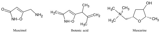 A. muscaria, generally known as the fly agaric or fly amanita, is a basidiomycete of the genus Amanita [82]. A. muscaria is widely recognized for its distinctive appearance with a bright red cap and white spots, remnants of the universal veil that covers the entire emerging mushroom during development [82]. A. muscaria is present throughout the temperate and boreal regions of the northern half of the Earth and in many countries in the southern half, commonly in symbiosis with pine and birch trees. A. muscaria contains several bioactive compounds that can have various effects on the human body (Figure 5). However, it is important to note that A. muscaria is a toxic mushroom and ingesting it can be extremely dangerous or even fatal. The main bioactive compounds found in A. muscaria include muscimol, ibotenic acid and muscarine. Muscimol (3-hydroxy-5-aminomethyl-1-isoxazole) is the primary psychoactive compound in A. muscaria. It acts as a GABA receptor agonist, which means it enhances the inhibitory neurotransmitter activity in the brain. Muscimol binds to the same site on the GABAA receptor complex as GABA itself, in opposition to other GABAergic drugs (like benzodiazepines or barbiturates) which bind to distinct regulatory sites [83]. GABAA receptors are commonly occurring in the brain, so when muscimol is administered, it modifies neuronal activities in multiple brain regions such as the cerebellum, cerebral cortex, and hippocampus [84,85]. Ibotenic acid ((S)-2-amino-2-(3-hydroxyisoxazol-5-yl)acetic acid) is a prodrug of muscimol, meaning it is converted into muscimol in the body. It has similar psychoactive effects to muscimol, but it is also known to cause excitotoxicity, which can damage nerve cells in the brain. Ibotenic acid is a potent agonist of the NMDA and group I and II metabotropic glutamate receptors, and a weak agonist of the AMPA and kainate receptors [86]. Muscarine is not the primary psychoactive compound in A. muscaria [82]. It is a toxin that primarily acts as a cholinergic agonist, stimulating the parasympathetic nervous system [87]. Muscarine can cause symptoms such as increased salivation, sweating, tearing, and blurred vision. A. muscaria should not be consumed recreationally or for any other purpose due to its high toxicity. The effects of ingestion can be unpredictable, and severe poisoning can occur, leading to symptoms such as nausea, vomiting, diarrhea, confusion, seizures, and even coma [88].