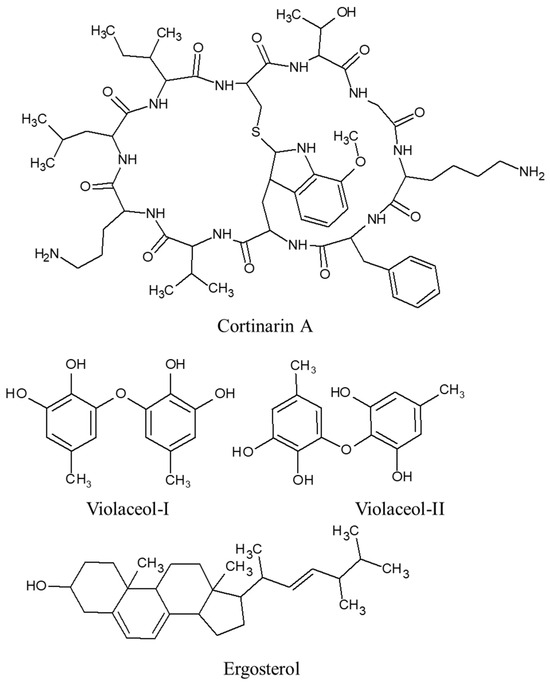 C. violaceus, frequently known as the violet webcap, is a species of mushroom belonging to the Cortinarius genus [89]. It is known for its vibrant purple color and is found in forests across Europe and North America [90]. C. violaceus has been studied for its chemical compositio and multiple bioactive compounds have been identified in this mushroom, such as cortinarin A, cortiloxin A, violaceol-I and -II, and ergosterol (Figure 6). Cortinarin A has been studied for its antimicrobial activity against various bacteria and fungi. It has also shown potential anti-inflammatory properties [91,92]. Violaceol-I and Violaceol-II are bioactive compounds that have been found to inhibit the growth of certain fungi [93,94]. Similarly, ergosterol is a sterol compound found in C. violaceus which has been associated with various biological activities, including antifungal, anti-inflammatory, and antioxidant properties [95]. However, due to the potential toxicity of C. violaceus, direct consumption of this mushroom is to be avoided.