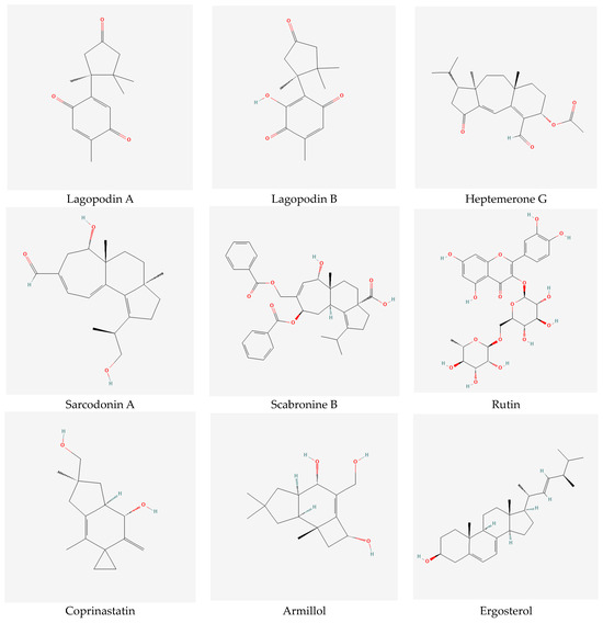 Stereochemistry plays a very important role in most biologically active compounds, including those extracted from mushrooms. Frequently, molecules that have the same molecular formula and the sequence of bonds differ in the orientations of some molecular fragments in three-dimensional space. This so-called stereoisomerism is extremely important in biology and medicine, since some stereoisomers are biologically active, while others are biologically neutral. Figure 8 shows the stereochemical structures of the biologically active stereoisomers of: lagopodin A, lagopodin B, heptemerone G, sarcodonin A, scabronine B, rutin, coprinastatin, armillol, and ergosterol. All images in Figure 8 were taken from PubChem, an open chemistry database at the National Institutes of Health.