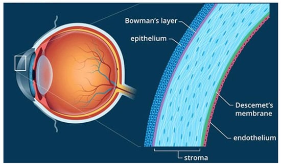 The multi-layered structure of the cornea as a dual mechanical and chemical barrier. Depicted are the epithelium, Bowman’s membrane, stroma, Descemet’s membrane, and endothelium. (Created by Wu et al., via BioRender, https://app.biorender.com/, on 10 June 2023).
