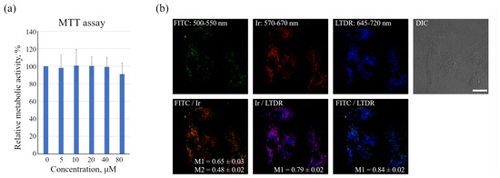 However, both chromophores remain in lysosomes. Firstly, the most expected cleavage products containing emitters are their conjugates with short peptides or single amino acids, mainly lysine, since this amino acid is the most abundant source of primary amino groups, the target conjugation functions for both FITC and Ir complex [48]. We suppose that the complete detachment of emitters from peptides or amino acids is unlikely due to their much lower susceptibility to cleavage by various lysosomal hydrolytic enzymes. Linking of the emitters to one or several amino acid residues makes them rather hydrophilic and, therefore, can suppress their lysosomal escape. Second, FITC is known as hydrophilic and thus as a membrane non-permeable compound. As a result, we have found rather high co-localization of both emitters with LysoTracker Deep Red (LTDR), with Manders’ co-localization coefficients (M1) of 0.84 ± 0.02 and 0.79 ± 0.02 for FITC and Ir complex, correspondingly (Figure 1b), even at 24 h incubation. Additionally, we have not observed the emission of Ir complex inside the cytoplasm, which also corroborates our conclusion regarding the primary localization of both emitters inside lysosomes.
