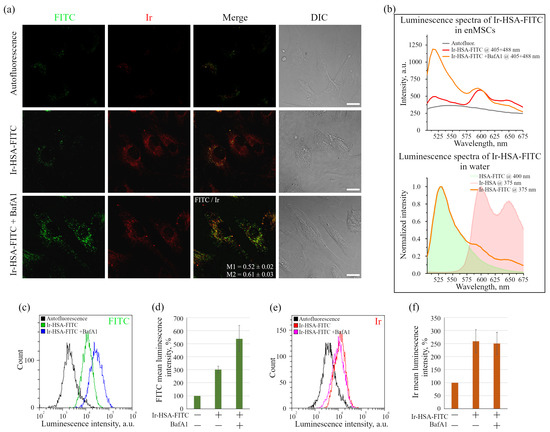 Luminescence of Ir-HSA-FITC (20 μm, 24 h) in enMSCs before and after addition of BafA1 (100 nM, 30 min). (a) Confocal images of enMSCs in green (FITC; 500–550 nm) and red (Ir; 570–670 nm) channels of luminescence and differential interference contrast (DIC). Control cells—autofluorescence. The images represent a projection of Z-stack onto a single image obtained by max intensity method (ImageJ). Representative images of the cells are presented. Scale bars 20 μm. (b) Luminescence spectra of Ir-HSA-FITC in enMSCs were obtained using spectral scanning mode (Mode/xy) of cells in the range of 505–675 nm with a step of 5 nm (luminescence excitation was carried out simultaneously by two lasers at 405 and 488 nm). Spectra were taken from the selected areas of the same size enriched in vesicles for every case (upper graph). For comparison, the spectra of HSA-FITC, Ir-HSA and Ir-HSA-FITC in water are presented in the lower graph (laser excitation wavelengths are indicated in the legend). (c–f) Flow cytometry analysis of cells after incubation with Ir-HSA-FITC (20 μm, 24 h) without/with BafA1 (100 nM, 30 min). Distributions of the luminescence intensity of cell populations in the FITC (c) and Ir (e) channels and the histograms of FITC (d) and Ir (f) mean luminescence intensity per cell are presented. The value of the cell luminescence without Ir-HSA-FITC indicates their autofluorescence and is taken as 100%. The results are presented as a mean ± SEM. Three independent experiments were carried out.