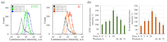 Dynamics of intracellular accumulation of Ir-HSA-FITC (20 μm) by enMSCs obtained by flow cytometry analysis. (a) The distributions of luminescence intensity of the enMSC population in FITC and Ir channels before (0 h) and after incubation with Ir-HSA-FITC for 2, 4, 24 h. (b) Flow cytometry analysis of Ir-HSA-FITC accumulation (2, 4, 24 h) and washout after media change (24, 48, 72 h) by enMSCs. The histograms of mean luminescence intensity per cell are presented. The value of the cell luminescence without Ir-HSA-FITC indicates their autofluorescence and is taken as 100%. The results are presented as a mean ± SEM. Three independent experiments were carried out.