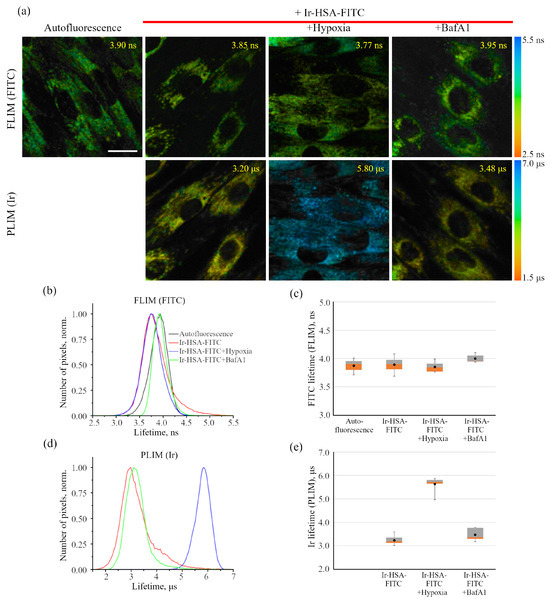 Fluorescence-lifetime (FLIM) and phosphorescence-lifetime (PLIM) imaging microscopy of enMSCs with Ir-HSA-FITC. (a) FLIM and PLIM images of enMSCs incubated without (autofluorescence) or with Ir-HSA-FITC (20 μm, 24 h). Ir-HSA-FITC-loaded cells were treated with BafA1 (100 nM, 30 min). Hypoxia was stimulated by substitution of air with nitrogen and the cells were incubated in hypoxic medium for 30 min. The values of the medians of the luminescence lifetimes of Ir-HSA-FITC for each image are presented. Scale bar 20 μm. (b,d) Distribution histograms of the luminescence lifetime values for Ir-HSA-FITC: FLIM for FITC (b), PLIM for Ir (d). (c,e) Box plots of values of the medians of the luminescence lifetimes of FITC fluorescence (c) and Ir phosphorescence (e) in enMSCs under different conditions from three independent experiments. In box plots, whiskers represent the minimum and maximum values, bases represent the interquartile range between the first (red) and third quartiles (gray), and midlines represent the median. Point symbols indicate the mean value. Three independent experiments were carried out.