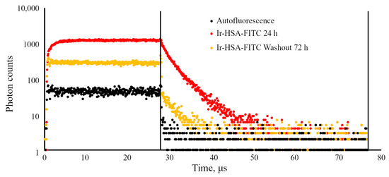 Ir decay curves obtained from PLIM images of enMSCs contained Ir-HSA-FITC (20 μm) after 24 h of accumulation and after subsequent washout for 72 h after media change. Decay curve for the cells without Ir-HSA-FITC are also presented (autofluorescence).