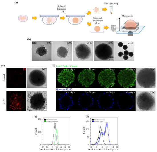 Spheroids were incubated with PI (40 μg/mL, 20 min at 37 °C) and analyzed using a confocal microscope. In this case, a positive control visualization of the dead cells in spheroids was achieved using PI staining performed 4 h after the stress insult by heat shock (spheroids were incubated at 45 °C for 30 min in the water bath).