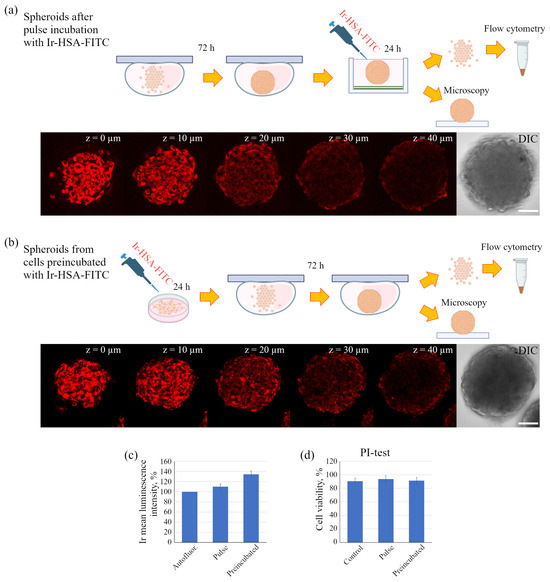 We performed experiments with the dual sensor in spheroids using two different protocols. In the first one, the preformed 3D spheroids were incubated with Ir-HSA-FITC (20 μm) for 24 h (pulse, Figure 7a), while in the second, 2D monolayer enMSCs were preincubated with Ir-HSA-FITC for 24 h followed by the formation of spheroids for next 72 h in sensor-free medium (preincubated, Figure 7b). At the same time, in the first case, the supply of a sensor from extracellular environment did not guarantee uniform saturation of the spheroid volume with the sensor, while in the second case, all cells in the spheroid had to contain the same quantity of the sensor initially. The analysis was carried out only in the Ir luminescence channel, since the level of background fluorescence in the FITC luminescence range was even higher in spheroids than in monolayer enMSCs and completely ruled out using of the green channel. On Z-series (optical sections was taken from bottom up to 40 μm), one can see that in both cases the Ir luminescence was recorded inside the spheroid and was localized precisely intracellularly with the absence in the intercellular space (Figure 7a,b). Flow cytometry also confirmed the presence of the sensor in the cells, but showed that the spheroids from the cells preincubated with Ir-HSA-FITC contained more Ir-HSA-FITC compared to the spheroids after pulse incubation (Figure 7c). Note that, according to PI-test, saturation of spheroids with Ir-HSA-FITC did not damage cells inside the spheroid (Figure 7d). Importantly, the monolayer enMSCs lost Ir luminescence during 72 h of incubation in the sensor-free medium, while in cells of spheroids, formed during the same 72 h from enMSCs preincubated with sensor for 24 h, Ir luminescence was perfectly detectable (compare Figure 3b and Figure 7b,c). Since there is no cell division in spheroids in our experiments, in contrast to a 2D monolayer culture, the decrease in the amount of the sensor in monolayer cells is most likely due to the dilution of sensor-bearing endolysosomes during cell divisions, rather than the release of the sensor or its hydrolyzed components into the surrounding space.