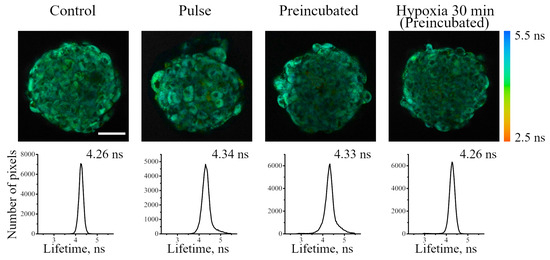 FLIM images of enMSC spheroids incubated without or with Ir-HSA-FITC (20 μm, 24 h) according to pulse or preincubated protocols. Preincubated spheroids were transferred into hypoxic medium for 30 min. Each image corresponds to optical cross-section at 30 μm along the z-axis. Scale bar 50 μm. The bottom row shows the distributions of FITC fluorescence lifetimes and median values for each case.