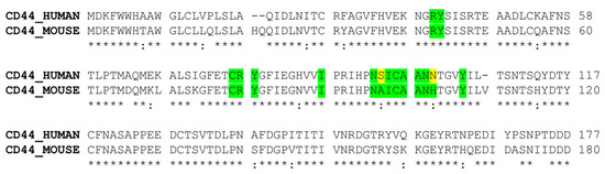 Sequence alignment between CD44 HBD deriving from human (Uniprot ID: P16070) and murine genes (Uniprot ID: P15379). The residues involved in the interaction with HA are highlighted in green when conserved and in yellow when changed in amino acids with similar properties.