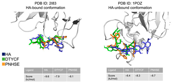 Two sets of crystal coordinates are available for the human CD44 HBD receptor: an HA-bound open conformation (PDB ID: 2I83 [46]) and an HA-unbound closed state (PDB ID: 1POZ [47]); however, it was decided not to use them beforehand to design the peptides since these coordinates do not include the 3D pose of HA. Hereafter, the DTYCF, PNHSE, and reference ligand HA were redocked against these two conformations to verify if the affinity seen in the murine CD44 HBD binding pocket was reproducible in the human CD44 HBD. Analysis of the results showed that the two peptides bind both the HA-bound open and the HA-unbound closed states of the receptor with significant values of docking scores. In particular, the selected peptides interact slightly better with the receptor in the closed state thanks to their ability to reach a hydrophobic site adjacent to HBD (Figure 3). Peptides recognizing CD44 HBD in both its conformations exhibit a greater number of binding points and therefore offer additional advantages compared to the HA reference compound that did not bind the two CD44 conformations with comparable affinity.