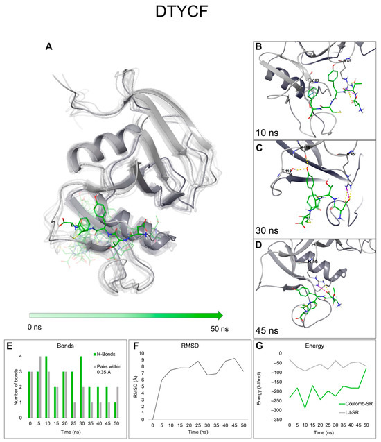 In the context of in silico drug design, it is good practice to prove the reliability of molecular docking results using a technique that reflects a dynamic environment. Accordingly, molecular dynamics (MD) simulations were carried out using a system filled with polarized water and a non-rigid receptor to evaluate the stability and reproducibility of interactions observed in the molecular docking binding poses. MD runs were carried out using GROMACS 2020.3 [48] and CHARMM36 force field [49]. The initial receptor/ligand complexes characterized by the best interaction score were subjected to minimization and two short runs under NVT and NpT conditions and finally let run for 50 ns. Table 1 reports the main interactions established by DTYCF and PNHSE during the run compared to those seen in the docking simulations. Figure 4A and Figure 5A show the trajectory frames saved every 5 ns of the two peptides in the binding site of CD44 HBD; as demonstrated by root-mean-square deviation (RMSD) values (Figure 4F and Figure 5E), the complexes reach conformational stability before 10 ns.