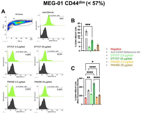 MEG-01 and hBM-MSC were stained with mAb against human CD44 FITC (338804-Biolegend) at the recommended concentration of 1 µg/test, NBD-conjugated DTYCF, and PNHSE at 2.5 µg/test and 25 µg/test. After 30 min incubation at 4 °C in the dark, cells were washed with staining buffer (PBS 2% fetal serum bovine plus 0.01% sodium azide), centrifuged at 1200 rpm for 5 min, and resuspended in the staining buffer for the FACS analysis. For each test, cells were analyzed using FACS Verse Flow Cytometer (BD Biosciences, Franklin Lakes, NJ, USA).