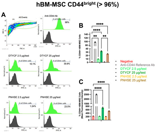 Fluorescence-Activated Cell Sorting (FACS) analysis was performed to verify if NBD-tagged DTYCF and PNHSE interact with the CD44 molecule on the cell surface. The fluorescence signal derived from the putative surface binding of both peptides was compared to that of a FITC-conjugated reference antibody anti-hCD44. To investigate the specificity of action and the versatility of the selected peptides, single-cell suspensions of hBM-MSC, CD44bright (>96%), and Megakaryoblastic cells (MEG-01), CD44dim (<57%) were used for the immunostaining procedure. MEG-01 and hBM-MSC were stained with FITC conjugated anti-human CD44 at the recommended concentration of 1 µg/test, NBD-conjugated DTYCF, and PNHSE at 2.5 µg/test, equivalent to a concentration of about 27.8 µM for DTYCF and 30 µM for PNHSE, and 25 µg/test, equivalent to 278 µM for DTYCF and to 300 µM for PNHSE.