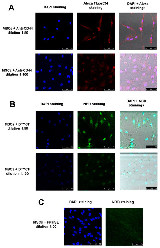 Immunostaining results: (A) DAPI-stained human bone marrow mesenchymal stem cells (MSCs) with Alexa Fluor594 stained anti-CD44 in two different dilution ratios (1:50, 1:100); (B) MSCs with NBD conjugated DTYCF in two different dilution ratios (1:50, 1:100); (C) MSCs with NBD conjugated PNHSE in 1:50 dilution ratio.