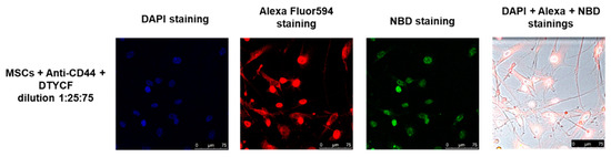 An immunostaining assay has been set and performed on hBM-MSCs in the presence of DTYCF, PNHSE and anti-CD44 (Abcam® RabMab EPR18668, unconjugated) as control. The cells were plated at 4 × 104/mL in a 24 well plates (n = 24) and grown for 24 h, then non-specific staining was fixed and blocked with albumin as per usual immunostaining SOP. Cells were stained with 4′,6-diamidino-2-phenylindole (DAPI). Four kinds of bindings were analyzed in the three rows of cells: in the first 0.1 mg/mL of anti-CD44 were added at two different dilutions (1:50, 1:100) and then Alexa Fluor594-conjugated secondary antibody was used to color the primary antibody; in the second 0.5 mg/mL of NBD-conjugated DTYCF were added at the two above-mentioned dilutions; in the third 0.5 mg/mL of NBD-conjugated PNHSE were added at the two above-mentioned dilutions; in the fourth both anti-CD44 and DTYCF were added in a proportion 25:75 for a competitive binding assay.
