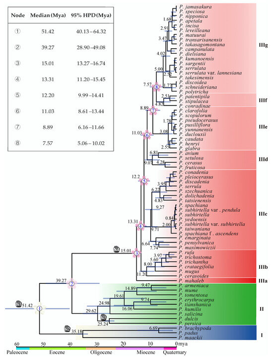 The estimation of divergence times provided valuable insights into the evolutionary history of Prunus. Molecular dating in this study indicated that subg. Padus diverged from subg. Cerasus and subg. Prunus in the early Eocene approximately 51.42 million years ago (Mya), with a 95% highest posterior density (HPD) ranging from 40.13 to 64.32 Mya. The subg. Cerasus separated from subg. Prunus in the middle Eocene around 39.27 Mya (95% HPD: 28.90–49.08 Mya) (Figure 3). However, the species in subg. Cerasus are much younger. The first divergence event within subg. Cerasus happened in the middle Miocene about 15.01 Mya (95% HPD: 13.27–16.74 Mya) when P. mahaleb diverged from the common ancestor (Figure 3). Soon, the lineage IIIb diverged 13.31 Mya (95% HPD: 11.20–15.45 Mya) and so forth. Noteworthily, (1) the Far East/North America taxa diverged from their sister members 9.71 Mya (95% HPD: 7.10–12.18 Mya, IIIc); (2) the eastern Chinese–Japanese–Korean members (IIIg) diverged from their close relatives (IIIf) 7.57 Mya (95% HPD: 5.06–10.02 Mya) (Figure 3).