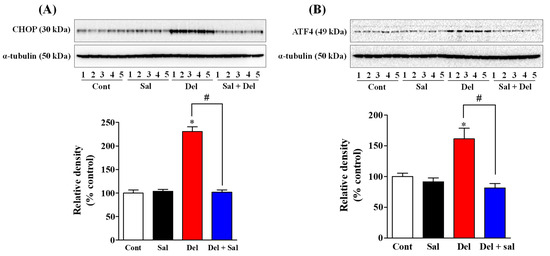First, we confirm whether the inhibition of eIF2α with salubrinal prevents the induction of ER stress caused by deltamethrin. We employed Western blot analysis to determine the levels of ER stress-related proteins CHOP and ATF4 after 48 h of exposure. Our results revealed a significant increase of 231% in CHOP protein (Figure 1A) and 161% in ATF4 protein (Figure 1B) in the hippocampi of mice treated with a single dose of 3 mg/kg of deltamethrin, indicating a substantial induction of ER stress compared to the control group. Remarkably, our data demonstrated that pre-treatment of mice with salubrinal effectively prevents the deltamethrin-induced activation of CHOP (Figure 1A) and ATF4 (Figure 1B) proteins in the hippocampus. These findings confirmed that salubrinal can prevent deltamethrin-induced ER stress in the hippocampi of adult mice.