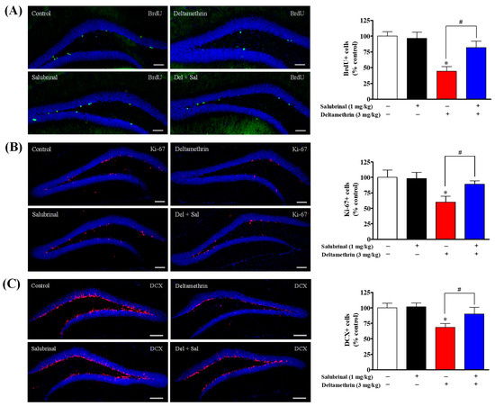 In a previous study, we demonstrated that deltamethrin exposure triggers ER stress and decreases hippocampal neurogenesis in adult mice. Here, we investigated the possible relationship between ER stress and hippocampal neurogenesis following acute exposure to deltamethrin (3 mg/kg). Total number of BrdU-, Ki-67- and DCX-positive cells are presented in Table S1. Our findings revealed that acute exposure to deltamethrin resulted in an approximately 2.27-fold decrease in BrdU-positive cells in the hippocampus compared to the control group (Figure 3A). Administration of salubrinal prior to deltamethrin exposure significantly counteracted this reduction in BrdU-positive cells. Animals treated with salubrinal exhibited a slight decrease (1.2-fold) in BrdU-positive cells compared to the control group. However, there was a significant 1.8-fold increase (p < 0.05) in BrdU-positive cells in salubrinal pre-treated animals compared to those exposed to deltamethrin alone (Figure 3A).