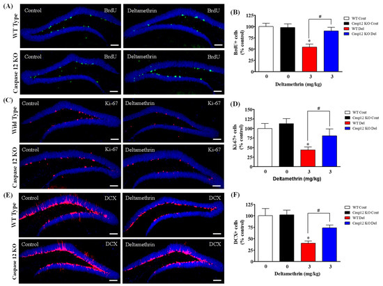 2.4. Caspase-12 KO Mice Are Protected from Deltamethrin-Induced Reduction of Hippocampal Neurogenesis in Adult Mice