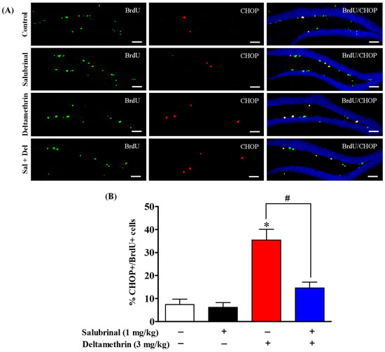 To determine whether neural progenitor cells (NPCs) undergo ER stress after deltamethrin exposure, we examined the expression of CHOP in BrdU- and Ki-67-positive cells using double immunofluorescence staining. Total number of CHOP-expressing BrdU- and Ki-67-positive cells are presented in Table S1. Our results showed that exposure to deltamethrin significantly increased CHOP-expressing BrdU-positve cells in the SGZ of the DG compared to the control animals (Figure 5). Similarly, CHOP-expressing Ki-67-positive cells were also significantly increased in deltamethrin-exposed animals compared to the control group (Figure 6). Interestingly, mice treated with salubrinal showed a significant reduction in the number of CHOP-expressing BrdU- and Ki-67-positive cells compared to animals treated with deltamethrin alone (Figure 5 and Figure 6).