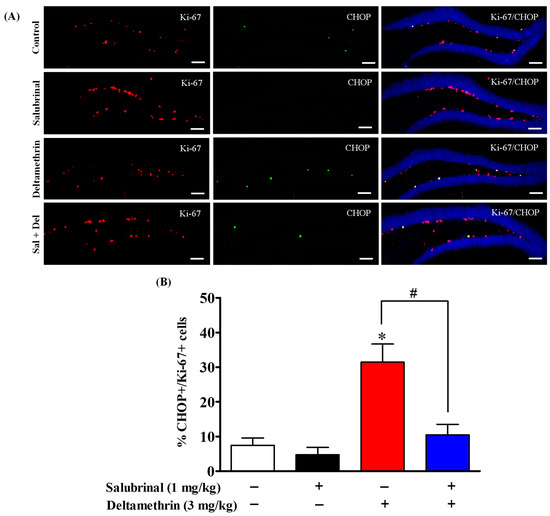 Salubrinal treatment attenuated the deltamethrin-induced increase in the number of CHOP and Ki-67 co-labeling cells in the DG of the hippocampi of adult mice. After 48 h of exposure to deltamethrin (3 mg/kg, p.o.), mice were sacrificed for histochemical assessment. (A) Representative triple immunofluorescence staining was conducted for Ki-67 (red), CHOP (green), and DAPI (blue). Positive cells in the subgranular zone (SGZ) were manually counted at high magnification (40×) using an All-in-One Fluorescence Microscope (BZ-X810, Keyence Corporation, Itasca, IL, USA). (B) The quantification of Ki-67/CHOP-positive cells (yellow) is presented in the bar graph. Representative images were uniformly adjusted for brightness and contrast using ImageJ 1.53 software to enhance the visualization of immunoreactivity. Positive cell quantification was performed on 12 sections per animal with 5 animals per group. The group mean was obtained by averaging the counts from these sections, and statistical comparisons were made using two-way ANOVA with Bonferroni’s post hoc test. An asterisk (*) indicates a significant difference from the control group, and a hashtag (#) indicates a significant difference from the deltamethrin when compared with the deltamethrin + salubrinal group (F 3,12 = 11.99; p < 0.005). Scale bar = 800 μm.