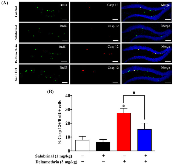 Salubrinal treatment attenuated the deltamethrin-induced increase in the number of caspase-12 and BrdU co-labeling cells in the DG of the hippocampi of mice. After 48 h of exposure to deltamethrin (3 mg/kg, p.o.), mice were sacrificed for histochemical assessment. (A) Representative triple immunofluorescence staining was conducted for BrdU (green) and caspase-12 (red), and DAPI (blue). Positive cells in the subgranular zone (SGZ) were manually counted at high magnification (40×) using an All-in-One Fluorescence Microscope (BZ-X810, Keyence Corporation, Itasca, IL, USA). (B) Representative images were uniformly adjusted for brightness and contrast using ImageJ 1.53 software to enhance the visualization of immunoreactivity. Positive cell quantification was performed on 12 sections per animal with 5 animals per group. The group mean was obtained by averaging the counts from these sections, and statistical comparisons were made using two-way ANOVA with Bonferroni’s post hoc test. An asterisk (*) indicates a significant difference from the control group, and a hashtag (#) indicates a significant difference from the deltamethrin when compared with deltamethrin + salubrinal group (F 3,12 = 10.20; p < 0.001). Scale bar = 800 μm.