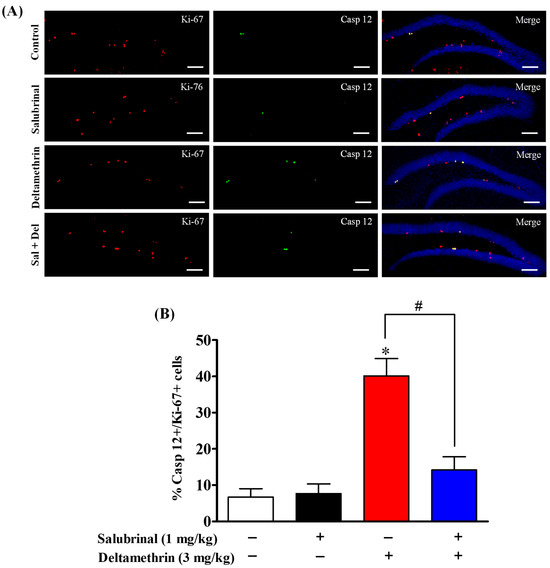 Here, we examined the expression of caspase-12 in BrdU- and Ki-67-positive cells via double immunofluorescence staining to ascertain whether NPCs undergo apoptosis following exposure to deltamethrin, as ER stress-mediated apoptotic death signaling can occur via the sequential activation of caspase-12 followed by caspase-3. Deltamethrin treatment resulted in a significant increase in the number of caspase-12-expressing BrdU-positive cells by 27% in the dentate gyrus of the hippocampus compared to the control animals (Figure 7). Similarly, there was a significant rise in caspase-12-expressing Ki-67+ cells by 40% in the deltamethrin-exposed animals when compared to the control group (Figure 8). Mice pre-treated with salubrinal showed a significant reduction in the number of caspase-12-expressing BrdU+ and Ki-67+ cells in the hippocampi of deltamethrin-treated mice (Table S1), indicating that NPCs may undergo ER stress-induced apoptosis after deltamethrin exposure.